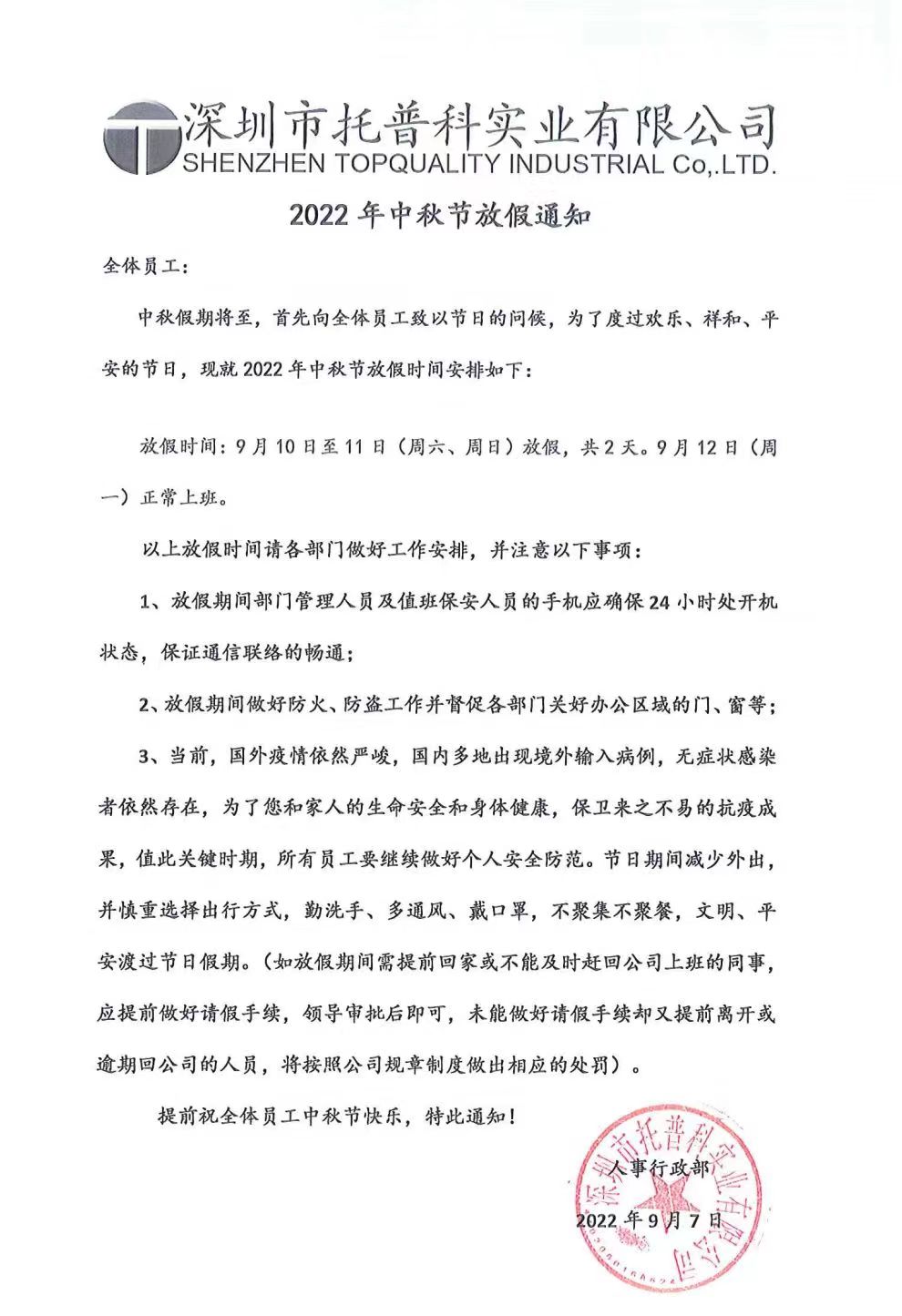 中秋节将至,根据《国务院办公厅关于2022年部分节假日安排的通知》,结合公司的实际情况,就2022年中秋节放假安排通知如下: