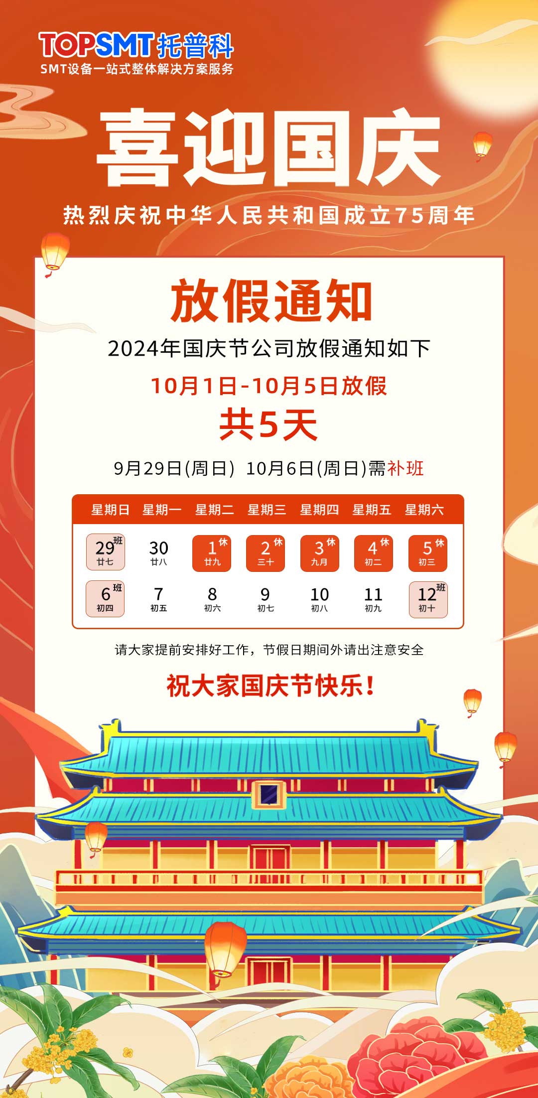 值此金秋送爽、举国同庆的美好时节,我们迎来了伟大祖国的75周年华诞。根据国家关于2024年国庆节放假的通知安排,我司特此向您公告我司的放假时间及相关服务调整事宜,以便您提前做好相应安排。